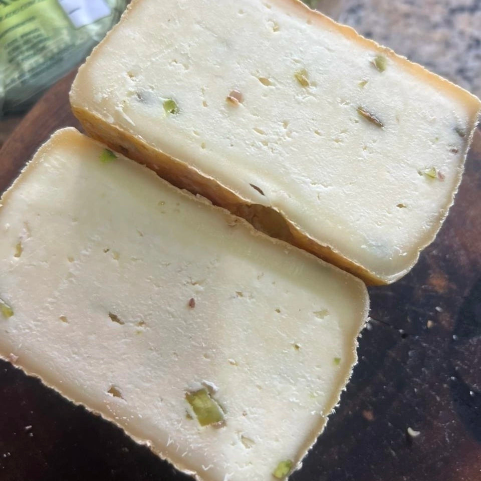 Diretamente de Lavras, Minas Gerais, este Queijo Minas Artesanal de leite cru encanta não apenas pela tradição de sua produção, mas também pela combinação sofisticada de sabores. Durante sua maturação, desenvolve uma casquinha amarelinha, fina e delicada, que protege sua massa macia e levemente cremosa. O toque especial fica por conta dos pedaços de pistache que vem da Itália, eles trazem um contraste único entre a suavidade do queijo e o crocante da oleaginosa.