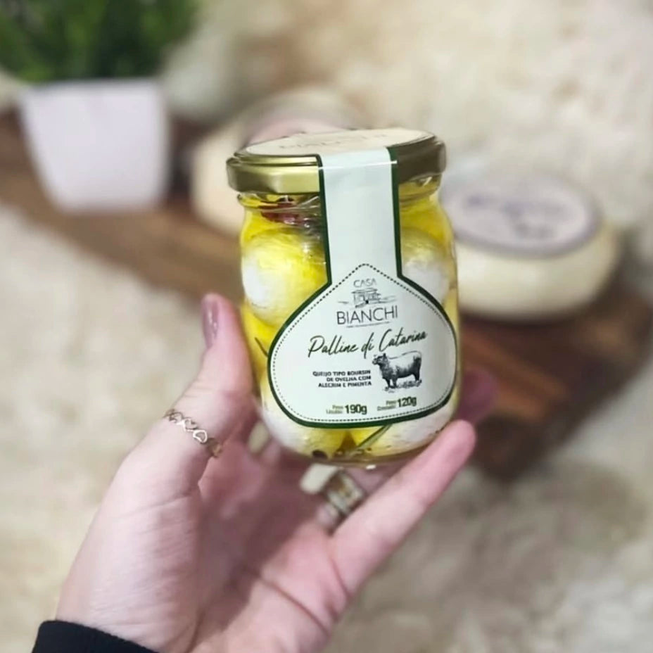 O Palline di Catarina é um queijo tipo Boursin, feito com leite de ovelha e cuidadosamente elaborado para dietas com restrição de lactose. Inspirado na tradicional receita criada pelo chef francês François Boursin em 1957, esse queijo combina a suavidade da textura macia e pastosa com o aroma marcante do alecrim e o leve toque picante da pimenta rosa, proporcionando uma explosão de sabores em cada mordida.