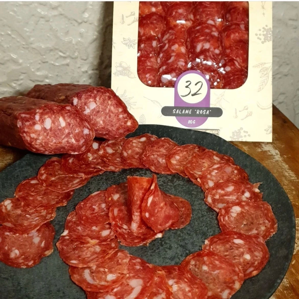 O Salame Rosa é uma das receitas mais emblemáticas da Zuca, trazendo uma combinação única de copa suína e toucinho, maturados por pelo menos 60 dias para alcançar um sabor complexo e envolvente. Suas notas cítricas, frescor e uma leve picância, proporcionada pela Pimenta Calabresa, destacam-se junto ao toque refinado de Pimenta Rosa, Cardamomo e Alho. O resultado é um salame artesanal que equilibra perfeitamente especiarias e texturas, oferecendo uma experiência de sabor irresistível.